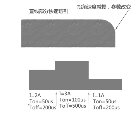 打破传统线切割控制器轨迹控制和参数设定相互不关联的状况,我们使加工参数能够随着加工轨迹按照最佳状态自动改变,系统内置E代码和M代码,可程序控制改变放电参数、运丝速度、跟踪参数甚至运丝张力。 右图实例中,在切割直线部分的时候,可以用大电流参数快速切割,当切割刀拐角部分时,自动减慢进给速度,改变脉宽脉间以及钼丝运行速度等放电参数,以避免钼丝挠度造成的轨迹变形,切割完拐角部分后程序自动控制加工参数回复到直线部分切割参数。 在切割不同厚度的工件时,也可以根据轨迹,在厚度变化的位置设置自动改变加工参数,使整机效率一直保持在最高效率。